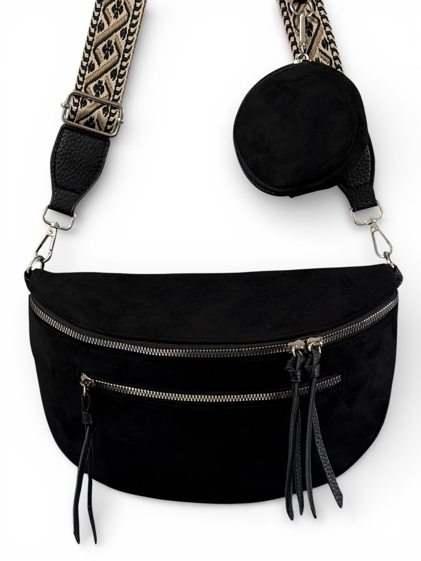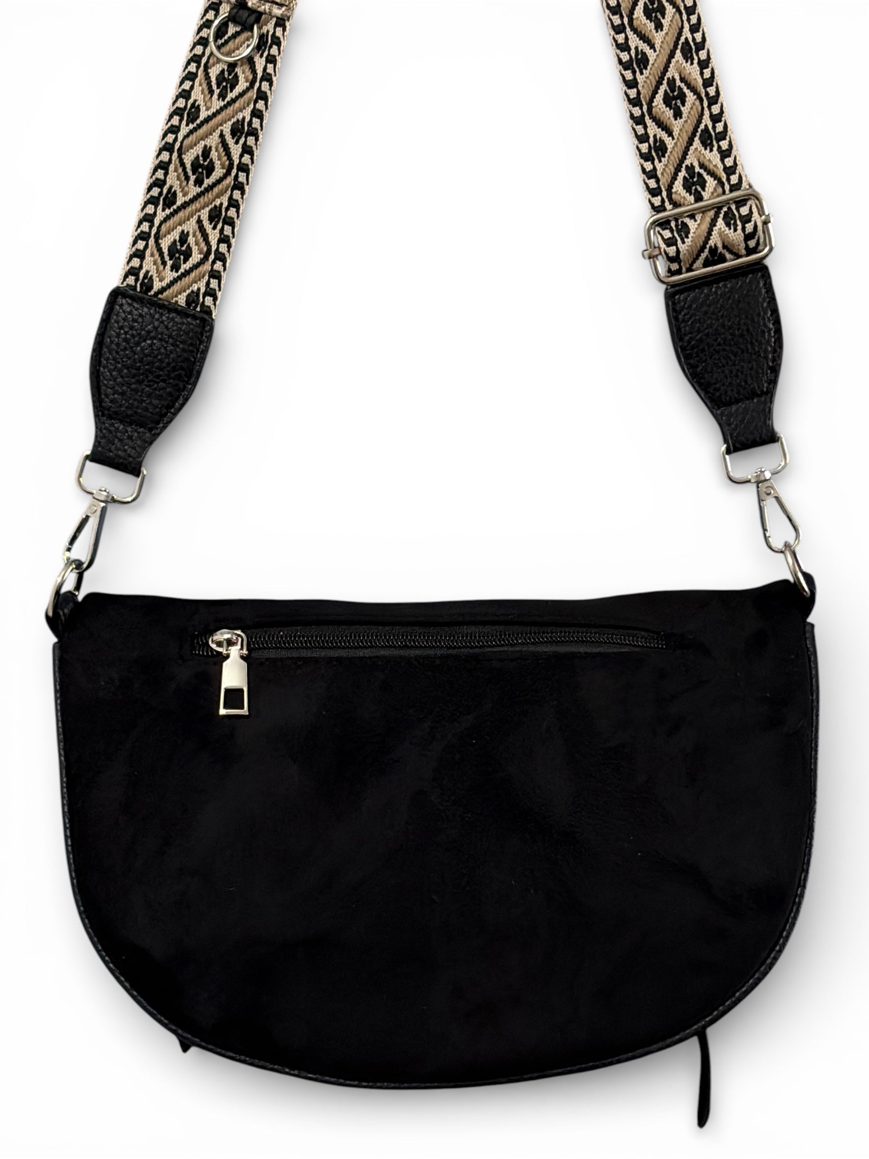 Sacoche noire en simili cuir daim, elle dispose d'une lanière détachable et ajustable (réglable). Finition très rigide. Port à l’épaule ou en bandoulière. Fermeture éclair argentée, 4 poches zippées.
