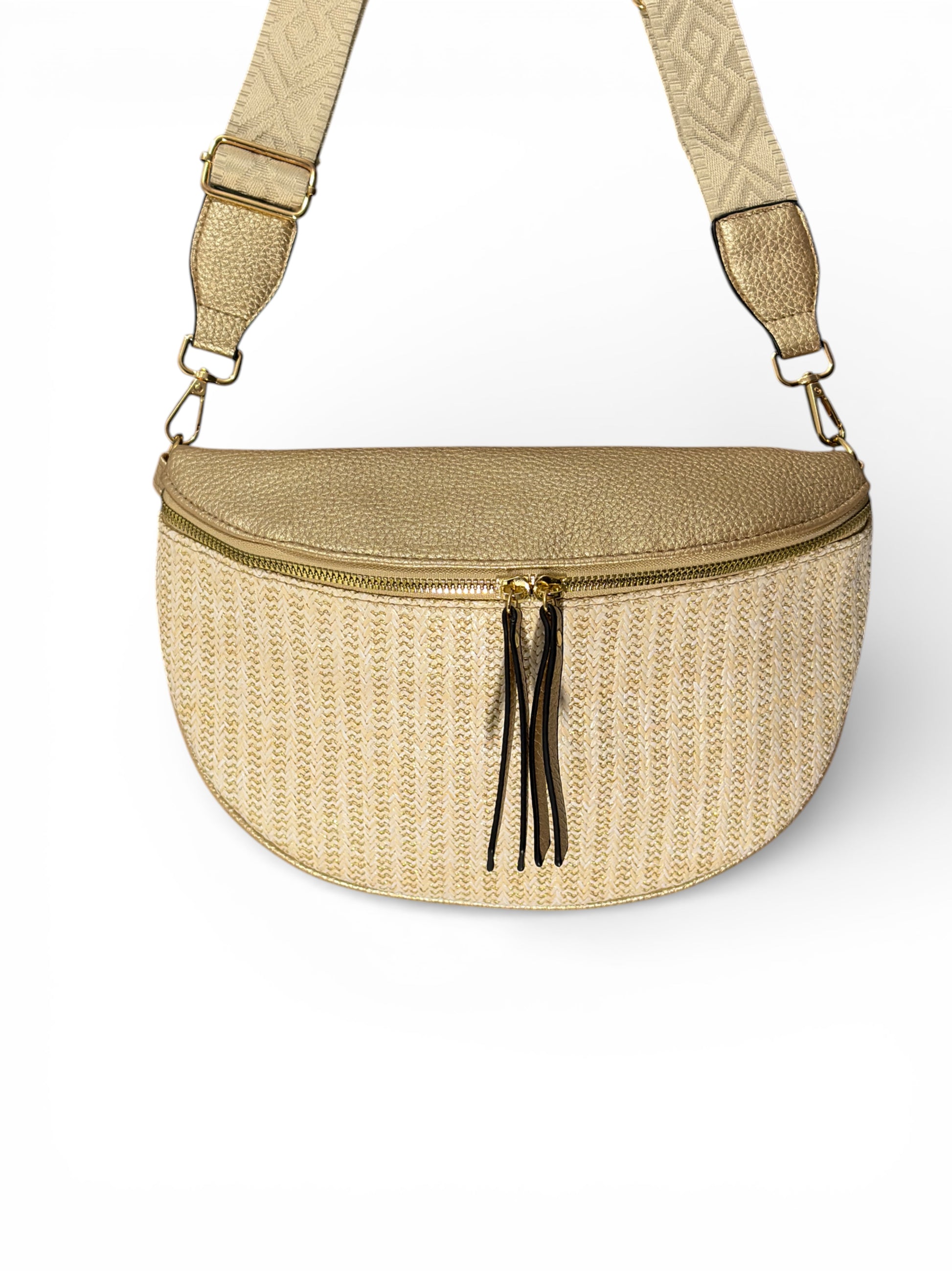 Grande sacoche banane de couleur dorée.